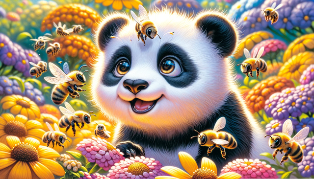 1)一只名叫阿悟的小熊猫兴奋地站在一片花丛中,眼睛闪着光芒,耳朵竖立,注视着一群蜜蜂在花间飞舞。蜜蜂的细节被突出显示,一些正忙碌地采蜜,而一条蜜蜂飞行的轨迹引领着阿悟的视线朝向一个未知的方向。