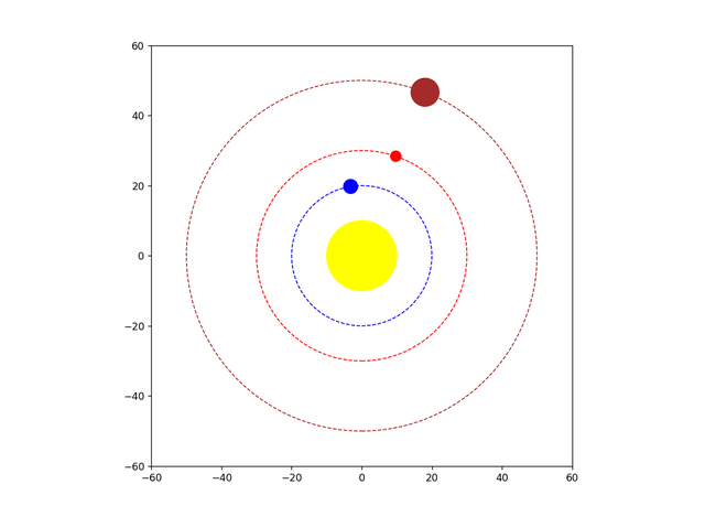 1)编写一个Python程序,使用matplotlib库来创建一个简单的太阳系动画。太阳系模型应包括太阳和至少三个行星(例如地球、火星和木星)。每个行星应围绕太阳按照不同的轨道半径和速度旋转。