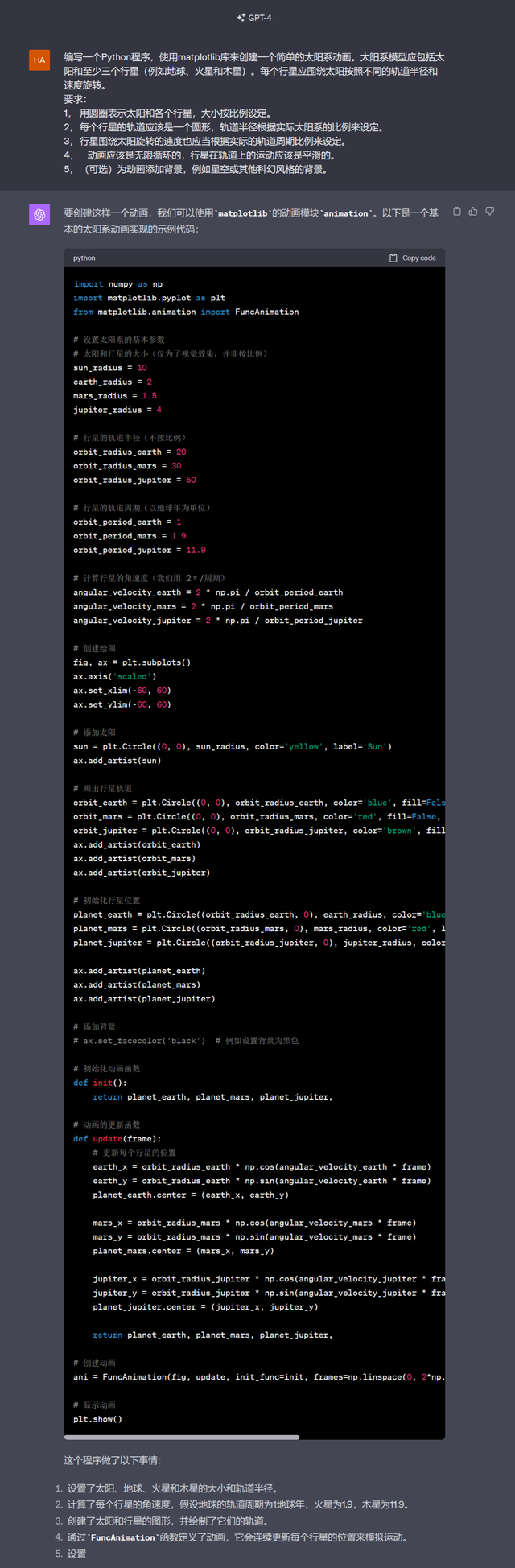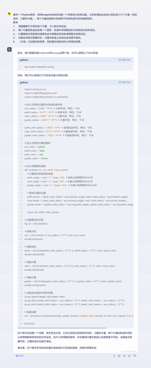 对比的结果非常显著:文心一言4.0编写的代码存在问题(需要人为修改),通过运行它写的代码没能出现符合题目要求的动画。再来运行GPT-4编写的代码,便出现了一个简单的太阳系动画,包括一个太阳和三颗行星,三颗行星都围绕着太阳以不同的速度做圆周运动。事实上,即使让一个学会了Python语言的人来编写这样的代码,也未必能够成功写出足够简单、正确且可运行的代码。
