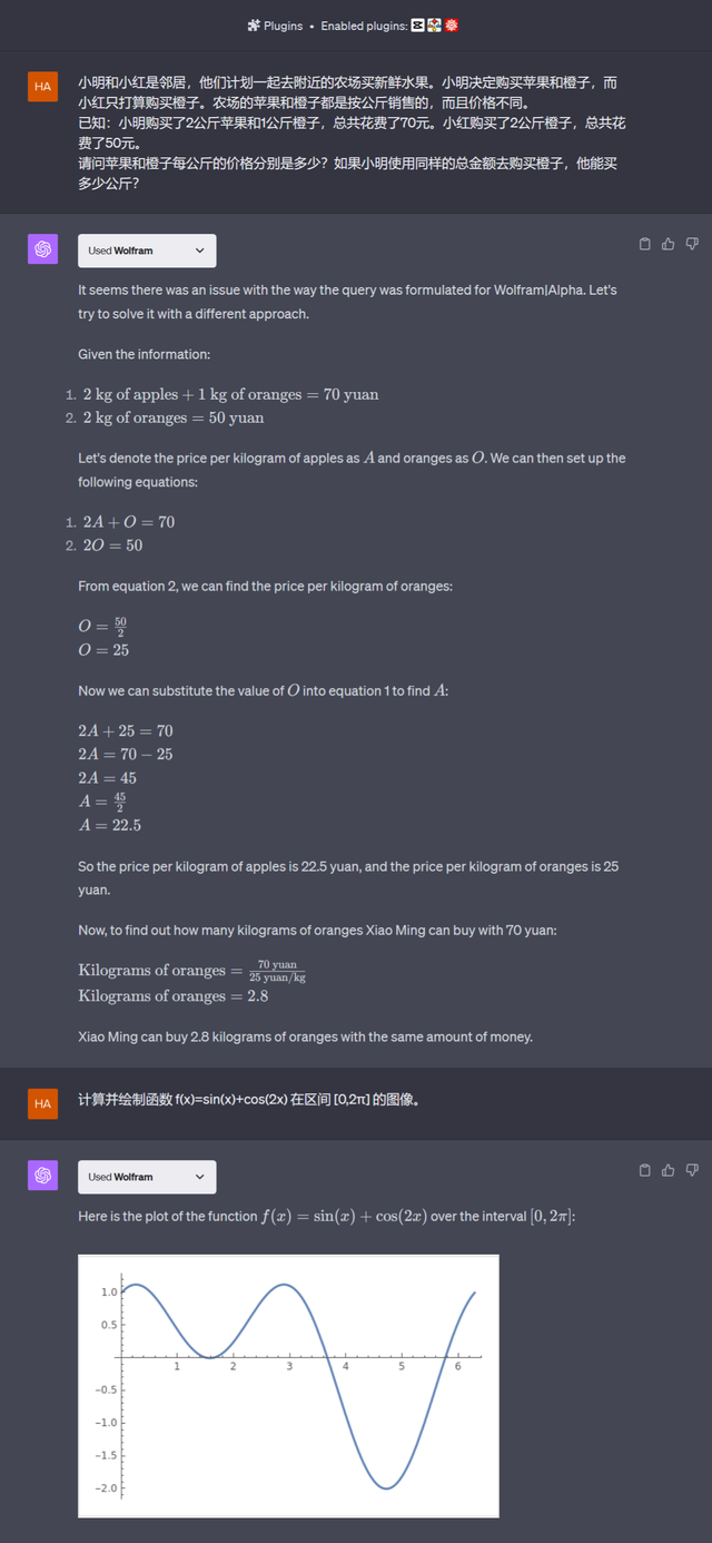 最后是数理运算。可以预见的是,随着AI大模型持续迭代升级,包括科学家、工程师等在内的专业技术型用户会使用AI大模型帮推理和运算,涵盖经济学、金融学、统计学、数学、物理学、化学、生物学、地理学等极其广泛的知识领域。不可否认的是,尽管GPT-4在进行数理运算时会犯这样那样的错误,有时候它连思考和解决问题的水平还比不上一个聪明的小学生——距离通用人工智能AGI还有着很长的路;但它可以自行调用插件进行推理运算,例如像wolfram alpha这样的计算知识引擎。
