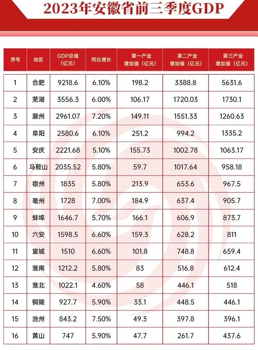 然而,从近期安徽前三季度经济成绩单上来看,芜湖还不太能“服众”,GDP总值二三四名加起来还没攒到第一位的体量,这个“第二极”有点名不正言不顺。
