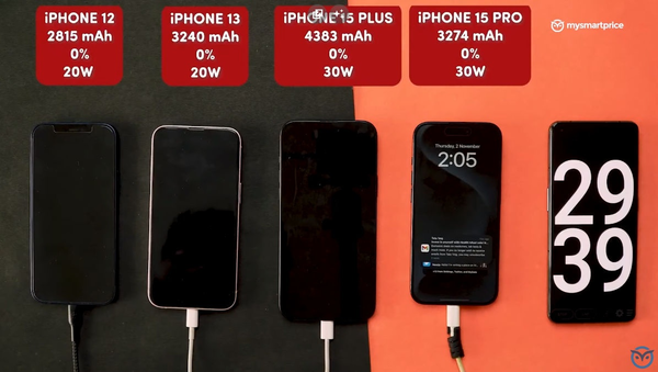 在充电测试中,外媒采用了统一的条件,使用氮化镓充电器和经过MFI认证的充电线。经过半小时的充电时间,iPhone 12充到了54%,iPhone 13充到了52%,iPhone 15 Plus充到了46%,iPhone 15 Pro以55%领先。