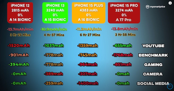 据悉,为了确保公平的竞争环境,外媒在四部iPhone均充电至100%的情况下开始测试。并且,每台手机都设置为最大亮度和音量,并更新到最新的软件版本。测试之前,我们先捋一遍四款手机的基础信息:iPhone 12拥有2815mAh电池,iPhone 13拥有3240mAh容量,iPhone 15 Plus拥有4383mAh电池,iPhone 15 Pro则配备3274mAh电池。