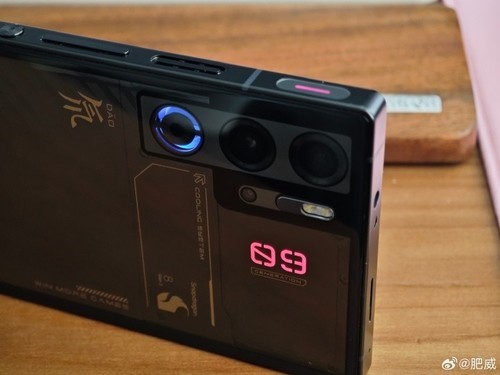 该博主表示,此次公布的新机为红魔9 Pro+氘锋透明暗夜,虽然厂商不允许透露细节,但是细节都在图片里。从其公布的图片中可以发现,红魔9 Pro+依旧延续了此前几代红魔的高颜值,值得一提的是,该机背部的相机模组正如宣传的那样没有突出,整个背部十分平整,看上去也很规整。新机背部还加入了呼吸灯和可点亮的“09”标识,配合上第三代骁龙8移动平台的贴纸和“氘”装饰,看上去非常炫酷。此外,新机还采用了平直边框,可以轻松立在桌上,类似一些三防手机。作为游戏手机,手机顶部依旧保留了3.5mm耳机孔,可以说“非常先进”了。