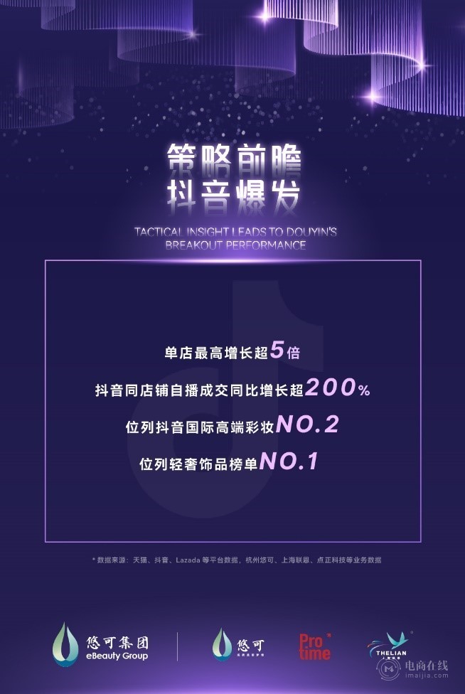 抖音渠道也有亮眼增长,悠可自播服务能力突出,同店铺自播成交额同比增长超200%,服务的单店最高增长达5倍,合作的某国际奢美品牌,位列抖音国际高端彩妆榜单NO.2,合作的某国际知名轻奢饰品品牌,位列轻奢饰品榜单NO.1。