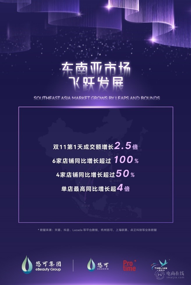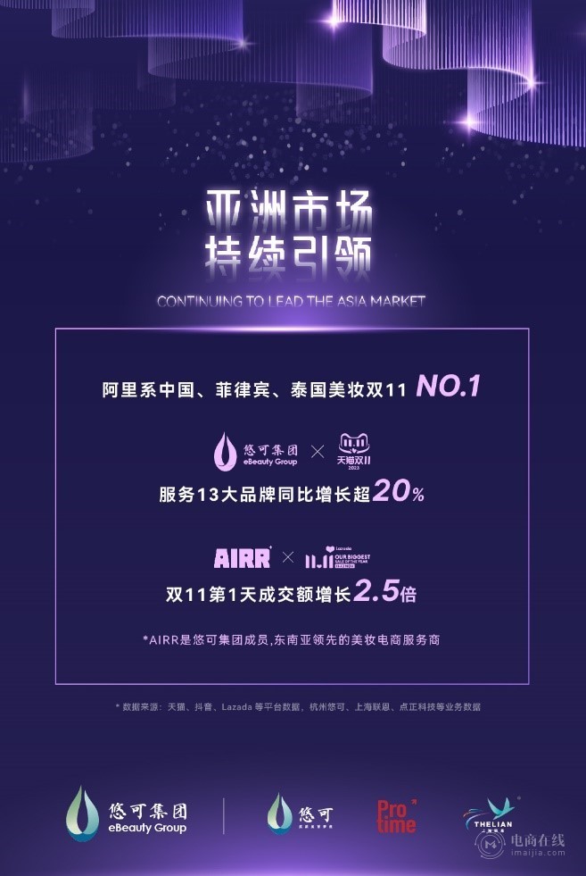 2023年双11,悠可集团持续引领亚洲市场,在阿里系中国、菲律宾、泰国美妆市场产生的GMV位列均位列同行NO.1,悠可服务的13个品牌同比增长超20%;旗下东南亚电商服务商AIRR.首日成交额较去年全周期增长2.5倍。