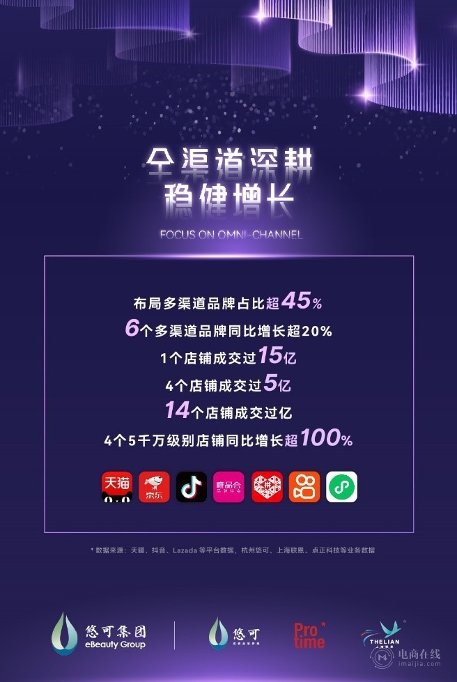 2023年,悠可集团持续布局多平台,为多个品牌同时在天猫、抖音、京东、快手等电商平台开展业务,多渠道品牌占比超45%,有6个品牌在多渠道的总GMV同比增长超20%。