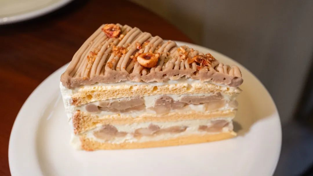 猿山次郎,是一款栗子蛋糕,选迁西板栗,自己煮自己磨,不是用的冻品,口感很多层次,从上到下分别是渍栗子,板栗奶油,栗子慕斯,杏仁蛋糕胚,底下有坚果蛋白饼,提供酥脆的响声,好的美食是调动不同感官的。