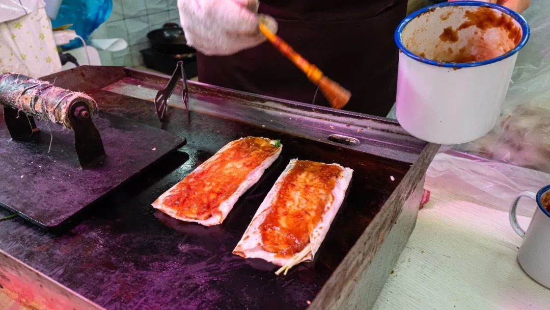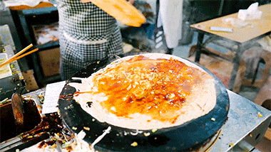 本地接地气的早餐,鸡蛋软饼,软饼上煎一个鸡蛋,包裹现炸的油条,抹上咸甜的酱,很饱足很美味。