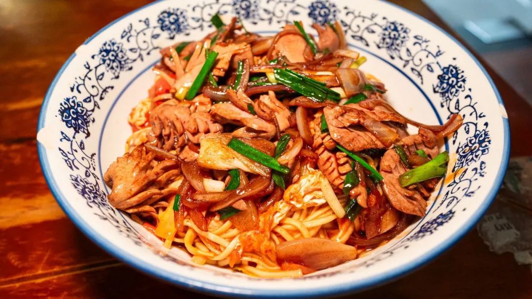 腰花茄汁拌川,面上有锅气,面条又兼并湿度,柔滑有嚼劲。高温下炒的鸡蛋像炸似的,炸出了很多空隙可以吸收酱汁,吸足汁水的蛋都特别好吃。