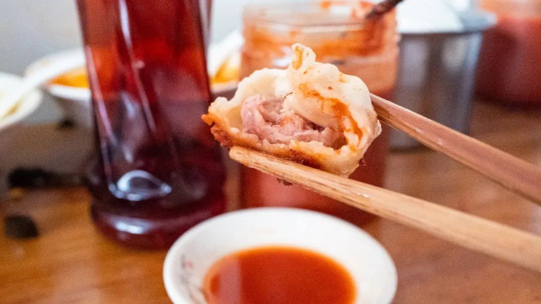 煎饺煎得底部脆皮焦香,咬下去有肉香。辣酱加醋混调就是一份很正的蘸水,蘸起来吃很上头,酸辣鲜香。