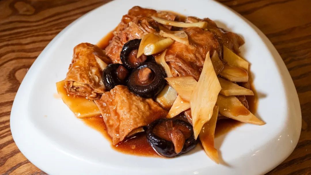 卷鸡,不是鸡,用是是香菇➕笋干,笋干泡出盐味,包进豆皮后再炸,之后浓油赤酱的红烧,加上香菇茭白很鲜美。