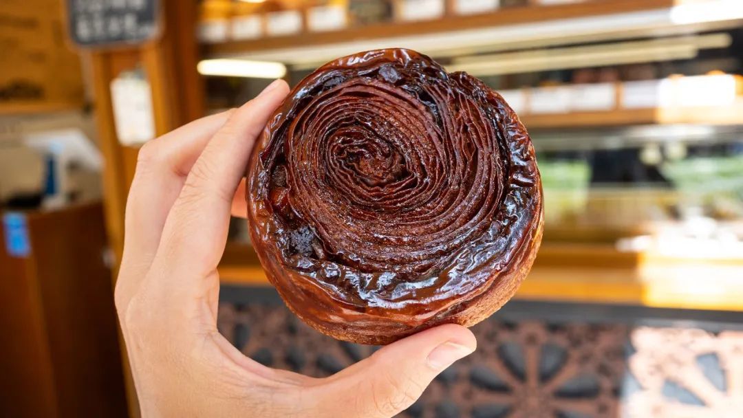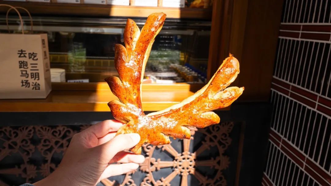 他们家的鹿角面包是原创的,形状像鹿角,外层酥香,里面是胡椒香料和坚果核桃,藏着咸芝士,总体是咸口的,很好吃。爱得不行。