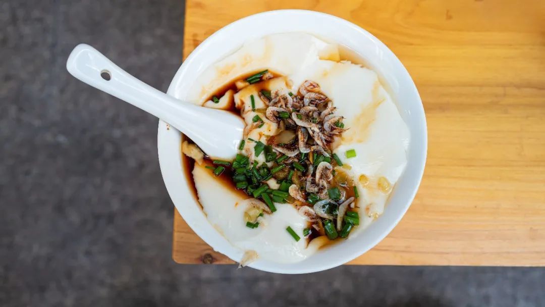 配上咸豆腐花,撒有虾干,豆腐嫩滑,来不及咀嚼就滑进嘴里,鲜味和滋味丰富。