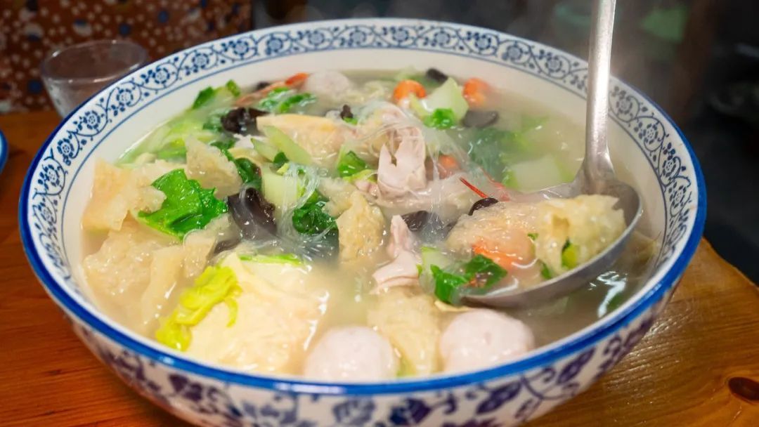 三鲜汤,杭州老底子的家常汤,蔬菜,响铃卷、蛋饺、丸子,味道鲜美,特别是丸子很鲜香脆弹。