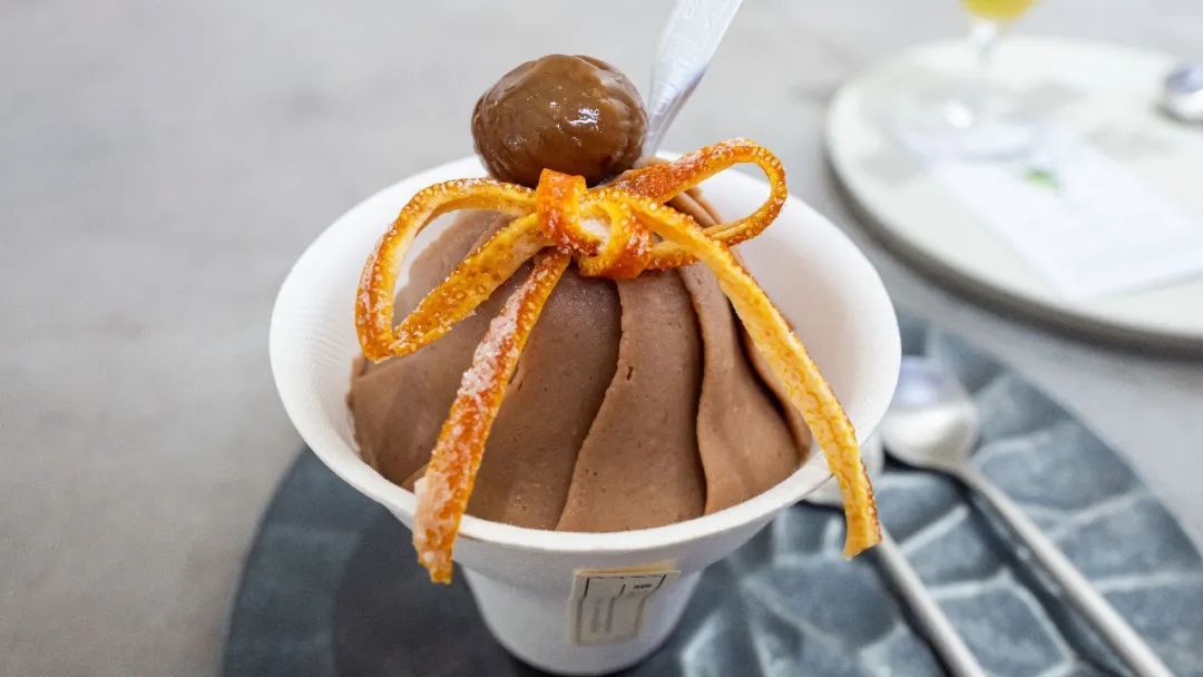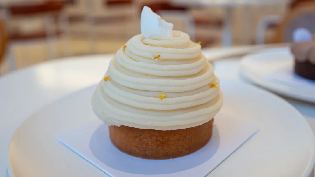 桂花山药蒙布朗,蒙布朗在法语中「Mont Blanc」,意思是白色的山。白色是如雪山的山药泥,山上点缀着金色的桂花,清丽淡雅。