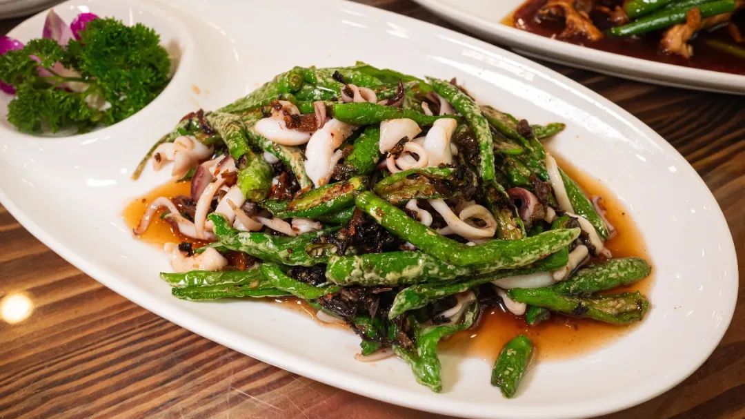 倒笃菜目鱼,倒笃菜是店家自己用九头芥菜腌制的咸菜,和雪菜很像,但是味道更丰富,咸香中带着酸爽,目鱼鲜美,加上青椒一起炒,滋味很丰满,非常下饭。