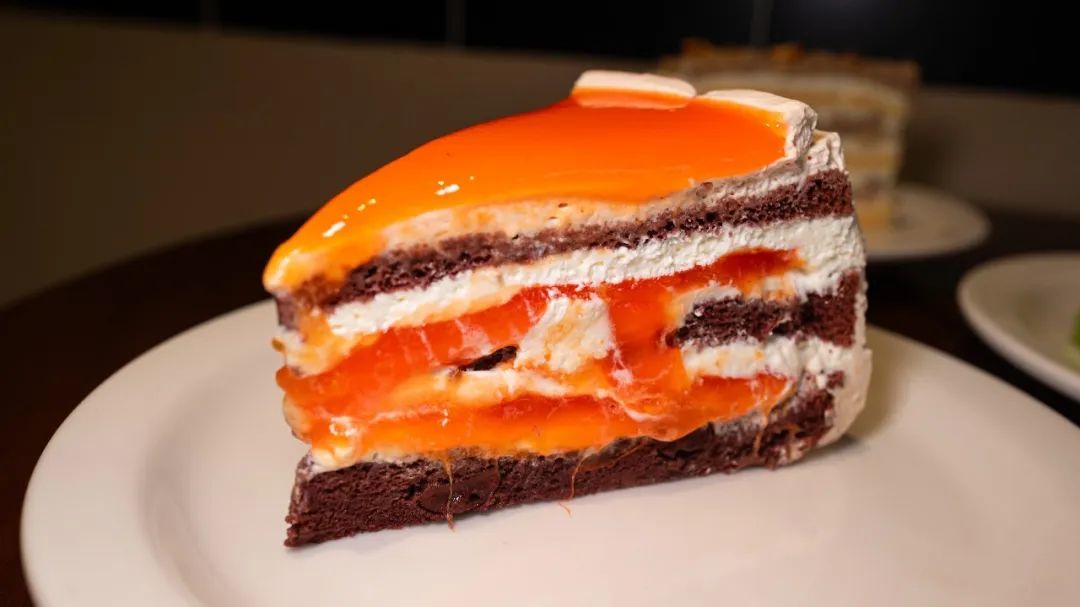 红茶巧克力柿子流心,秋季的流心柿子,淡淡的动物奶油,一层层吃下去,先是奶油的轻盈,接着是柿子的甜美果香。