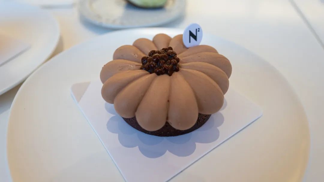 四重巧克力花椒,外表看起来憨憨的,其实是很有趣的味道,巧克力里突出的花椒味道很特别。奶油吃起来冰冰的,顶上有像鱼子酱一样的可可冻,挖开里面藏着金桔和薄脆,柑橘香和趣味性的口感,整体很有新意。