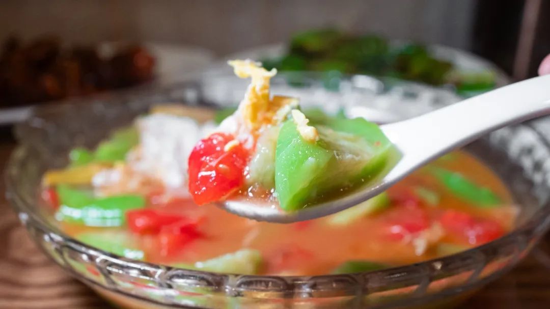 家烧丝瓜,杭州本地家常菜,色彩很鲜艳美丽,番茄的鲜味,炒鸡蛋的鲜味。