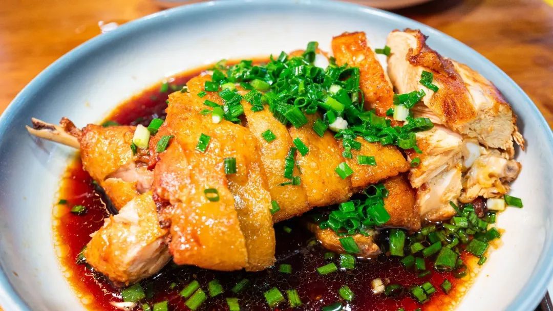 油淋鸡,他们家的鸡做得很好吃,用的是三黄鸡。鸡蒸到刚好熟,不让肉质变老,再油淋,淋到皮脆,肉的部分还保持鲜嫩多汁。淋上葱油,香气很浓郁。