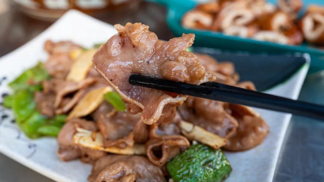 爆炒门腔,门腔=猪舌。猪舌薄切炒的很有弹性很嫩多水分。老板娘透露了私人秘籍,用木瓜汁腌肉,会让肉更嫩而没有木瓜味。