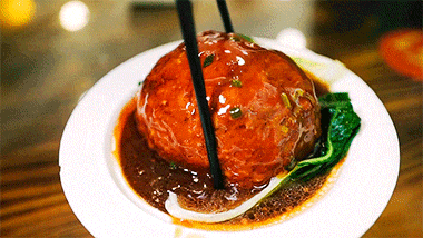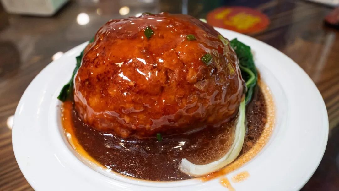 狮子头,肉炖了四到五个小时,非常绵松,猪肉里只加了鸡蛋和一点点的淀粉,肉感十足,却放进嘴巴用舌头一抿就化开了。咸甜口味,鲜美的不行。