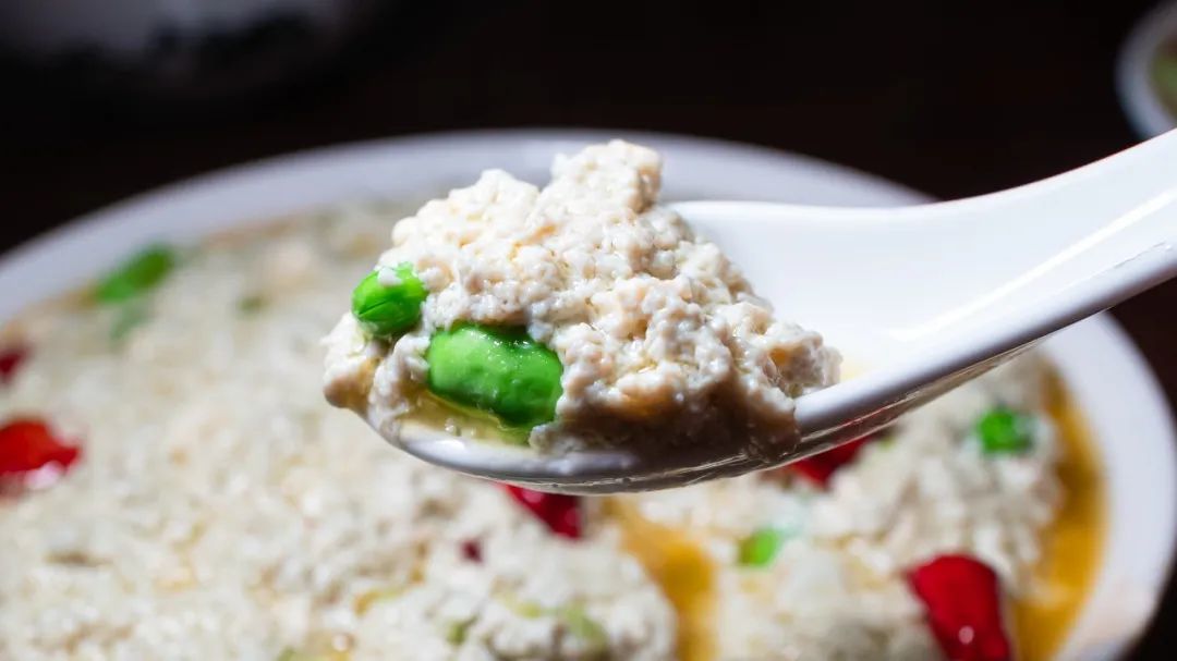 毛豆臭豆腐,第一口很臭,细细品味会回甜有奶香,毛豆提供植物蛋白的鲜味。他们家的臭豆腐是用三到五年的苋菜梗(也是很刺激的味道)的卤来发酵的臭豆腐,所以特有极致的风味。