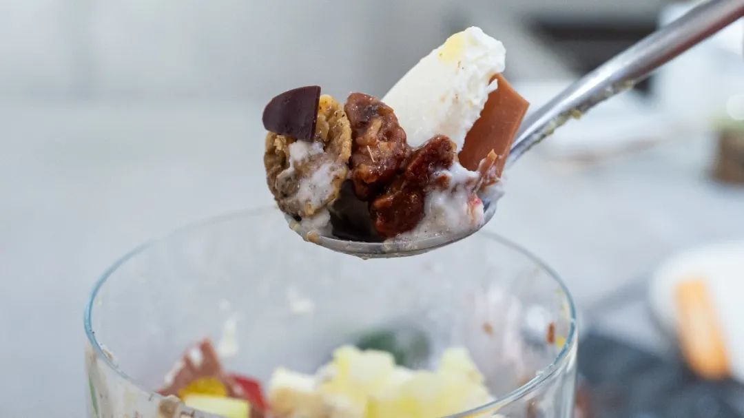 猿山芭菲三号,太美丽了。拿出来就觉得赏心悦目,月光、美酒、西湖为意象,红酒、巧克力、坚果口味定,芝麻泡芙是月球,芝麻雪芭是地球相呼应。