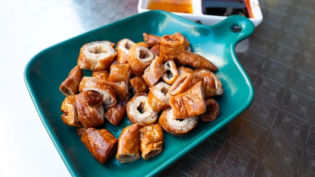 脆皮大肠,先卤后炸,外皮特别香脆有油香,没有异味,里面保留了大肠的脂肪,咬下去一声脆响,先是油炸后美拉德的香气接着是软糯的肥肠,爆发出动物脂肪的香气,没有异味,皮脆内里软糯,蘸梅子酱很好吃。
