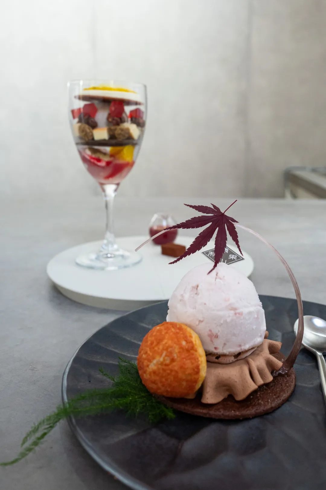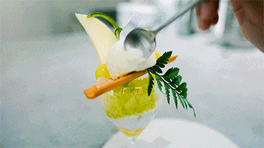 猿山芭菲一号,蜜瓜gelato网纹瓜本瓜的味道,很清爽甜美。高野蜜瓜果汁制作的碎冰很清新,中间的戚风蛋糕有口感上的缓冲作用,底部是清酒做的啫喱带有酒香。
