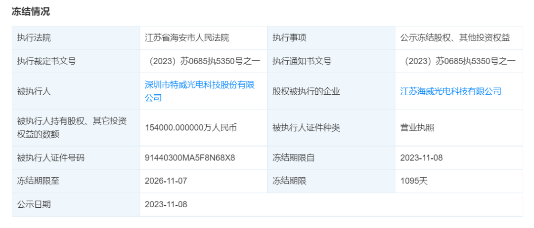 集微网消息,天眼查显示,近日,深圳正威(集团)有限公司旗下深圳市特威光电科技股份有限公司新增一则股权冻结信息,股权被执行的企业为江苏海威光电科技有限公司,冻结股权数额15.40亿元,冻结期限自2023年11月8日-2026年11月7日。