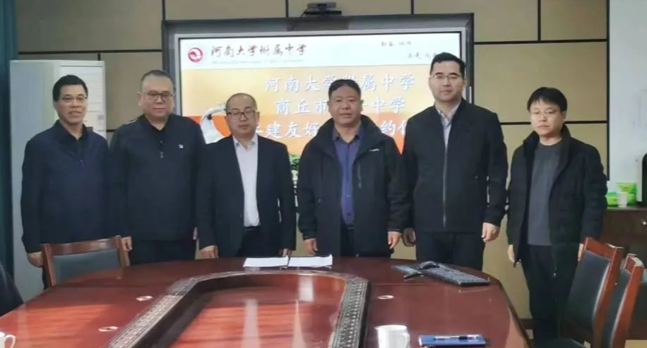 为持续深入开展汴商两地教育交流活动,促进教师专业成长,推动教育资源共享,提高教育教学成绩,近日,商丘市第一中学党委书记、校长王付山,副校长薄延东、副校长尹来恩前往开封,与河南大学附属中学签订“手拉手友好学校”协议书。两校领导教师相聚一堂,共话合作,共谋发展。