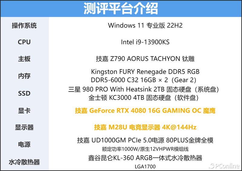 当然了,有顶级的显示器,少不了出色的硬件。为了最大效能地发挥这款显示器的潜力,我们在游戏中开启了光追特效,并且使用了4K分辨率来体验。所以,在显卡方面,我们选择了一样是技嘉的GeForce RTX 4080 16GB GAMING OC。