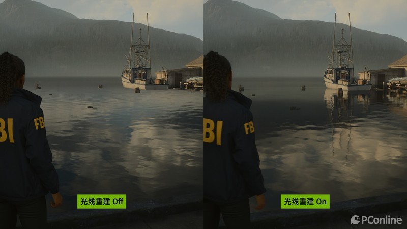 不信,给大家对比一下就知道了,我们用同一个画面,在技嘉M28U电竞显示器上对比,从场景的阴影和反射中,我们可以看到路径追踪对画面真实度的再一次提升。就拿远处水面上的小船来说,开启光线重建后,小船的倒影能够实时反应在水面,并且天空在技嘉M28U的高色准加持下,在水面中的倒影也更符合当时游戏中黄昏的时间点。