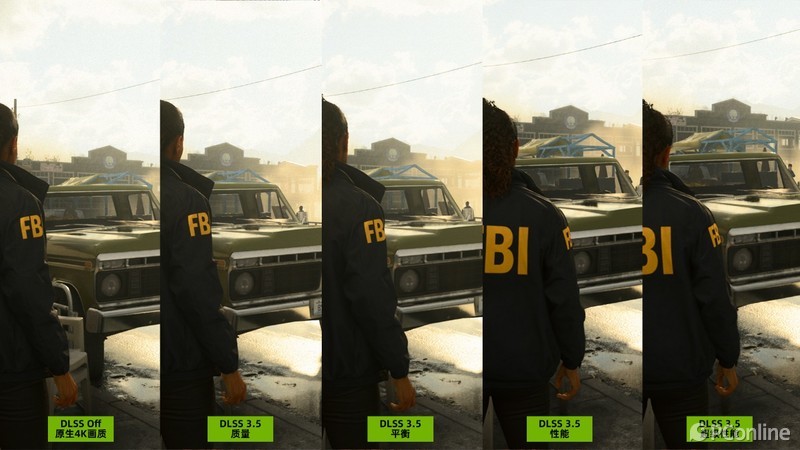 并且我们也录制了原生4K以及DLSS 3.5的四档画面在ICAT中进行画质对比。实测下来,不得不说老黄的DLSS 真的有点东西,即使开启帧生成后,画面是用低分辨率超分渲染至4K的,但观感上与原生4K几乎没有任何差距,无论是水面反射还是建筑纹理全都清晰、锐利。
