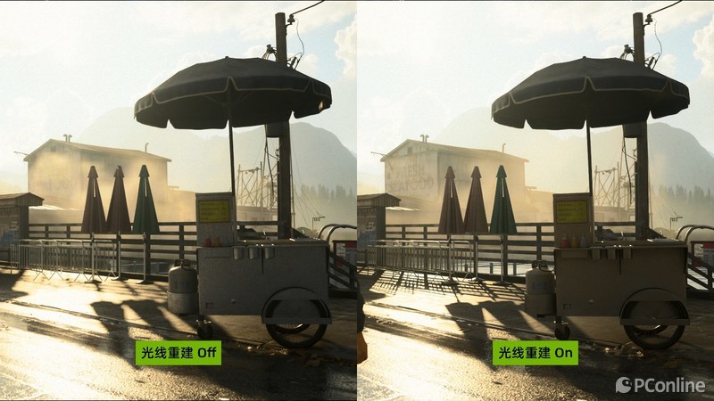 在另一个场景也是如此,有了光线重建后光线的光路更加合理,例如右侧的栏杆被阳光照射后会形成倒影,而左侧则没有这种效果。并且前方的餐车的背光面应该更暗淡些,这一点在技嘉M28U上就体现得淋漓尽致,4K分辨率以及不错的色彩表现,让游戏的效果有了质的提升,仿佛身临其境一般。