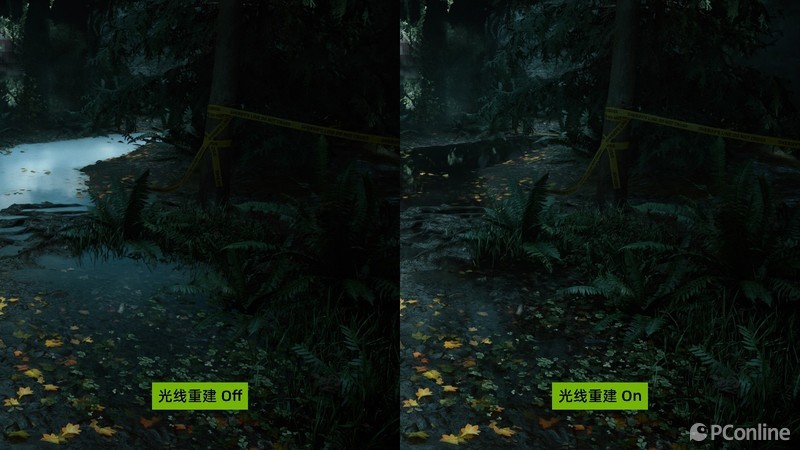 昏暗的案发现场似乎要更明显一些,首先是开了光线重建后,水面倒影会更加贴近现实,映照的是周围树木以及落叶,而没有开启的一侧则是模糊一团。并且在技嘉M28U高达1000:1对比度的加持下,树林的暗部细节也清晰锐利,配合光线重建技术,好像有种换了更高清分辨率的感觉。