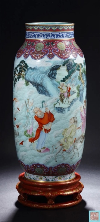 古董珍玩板块展出各式明清重要宫廷器物。其中一件清乾隆御制洋彩胭脂红地轧道通景“八仙庆寿”江山一统尊(连珊瑚红描金彩瓷座),以精湛的画技和高超的工艺生动描绘了“八仙庆寿”的情景,底贴“崇礼进十五号”黄签更揭示出其显赫来源。北京保利国际拍卖有限公司 古董珍玩部高级业务经理邹德馨表示,据黄签所录与档案对照,该瓷瓶即彼时清朝官员崇礼进奉慈禧的寿礼。