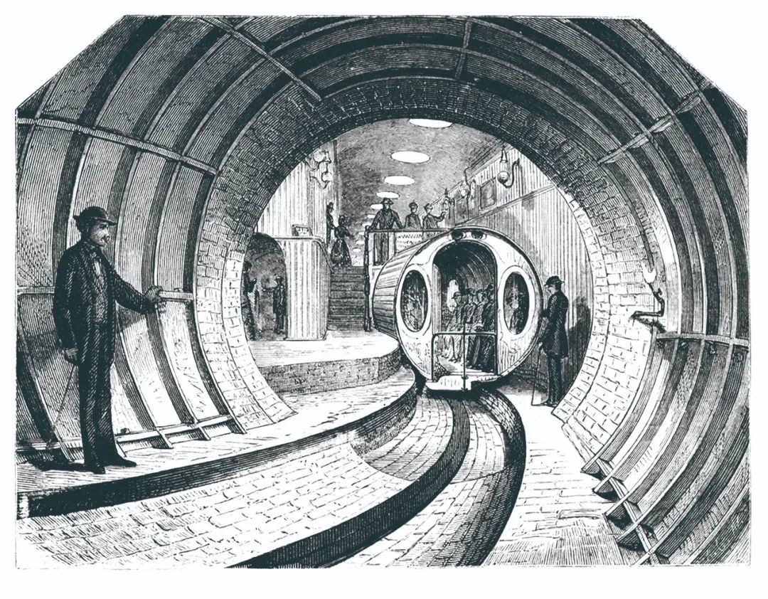 1869年,一个美国商人打造了“土霄飞车”,在放大版的气动管道里有一辆巴士,可搭载22人。