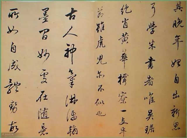 比其晚年,始自出新意耳。学米书者,惟吴琚绝肖。黄华、樗寮,一支半节,虽虎儿亦不似也。古人神气淋漓翰墨间,妙处在随意所如,自成体势,故