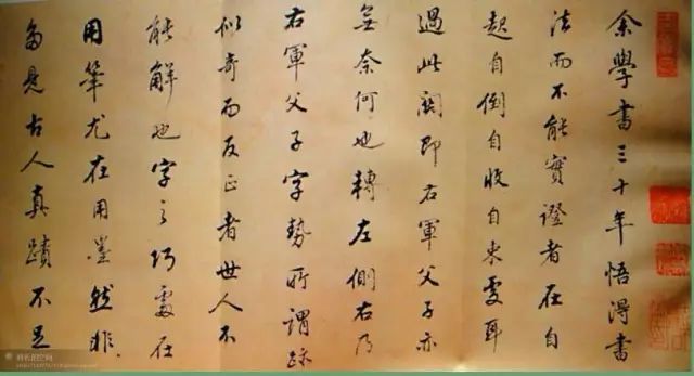 余学书三十年,悟得书法,而不能实证者,在自起自倒、自收自束处耳。过此关,即右军父子亦无奈何也。转左侧右,乃右军父子字势。所谓迹似奇而反正者,世人不能解也。