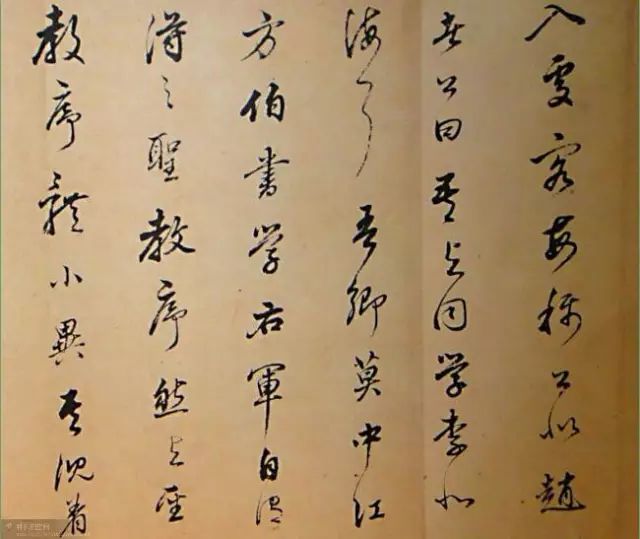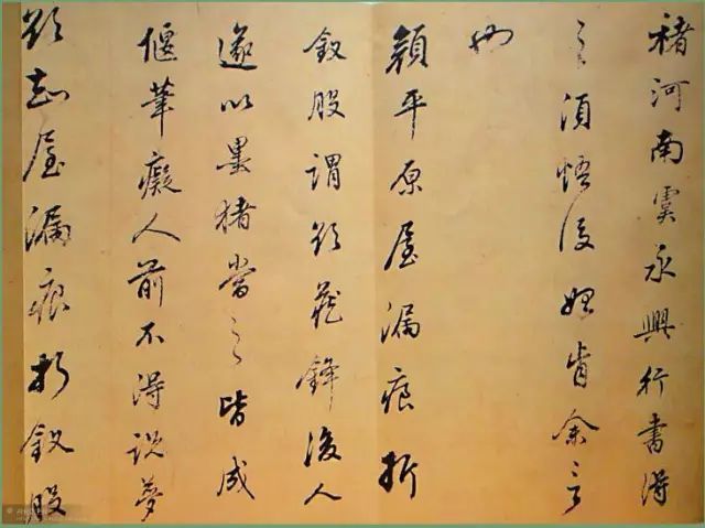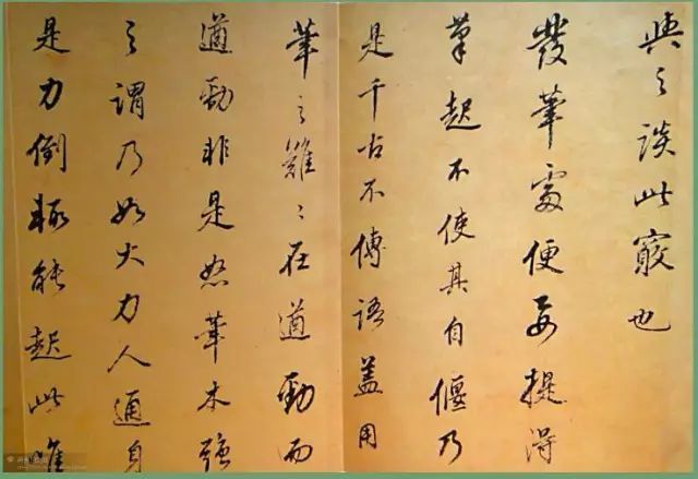 褚河南、虞永兴行书得之。须悟后肯余言也。颜平原屋漏痕,折钗股,谓欲藏锋。后人遂以墨猪当之,皆成偃笔,痴人前不得说梦。欲知屋漏痕,折钗股