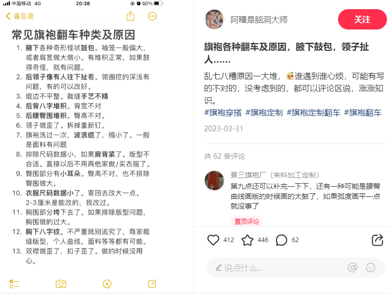 而旗袍上的质感触感,光看视频无知无觉,但穿到身上难以忽略。在社交平台的相关避雷帖中,“质感差”是广受诟病的一点,要么“穿着很扎”,要么“特别容易皱”,其次就是细节不够精致,线头太多、盘扣不牢、针脚歪斜,都是问题。