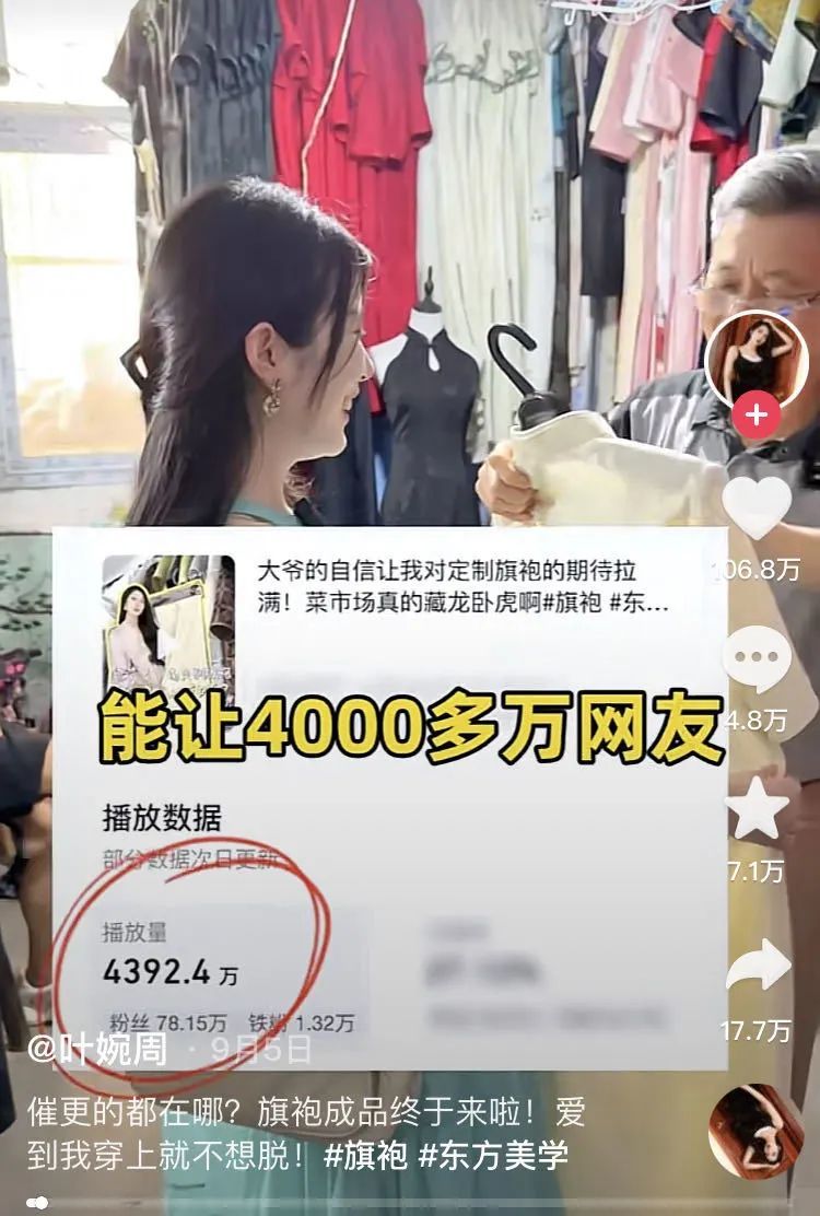 视频里的旗袍店布置简单甚至简陋,穿上旗袍的人却个个明艳活泼、绝世容光,越是在菜市场,越是显得雅致婉约、韵味十足——当然这效果不能说是“大变活人”,毕竟拍视频的博主们本就窈窕。
