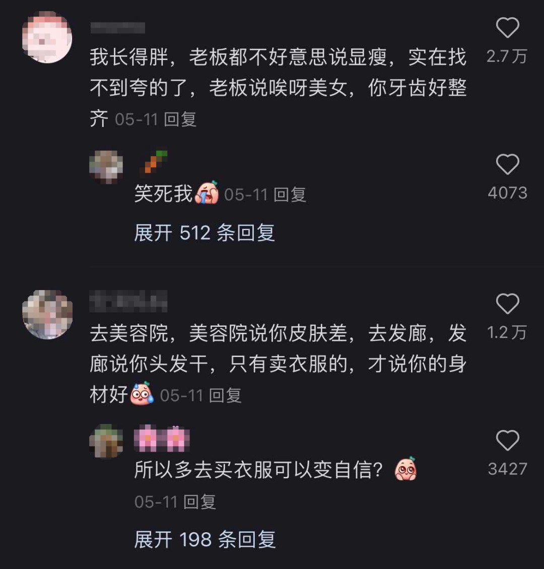 一来店主们深谙高情商表达法,如果觉得你挑的花色显老,会婉拒道“这个带回去给你妈妈穿”,发现你拿不定主意时,会宽慰道“你穿什么都好看”,要是想让你换个花色,会拉踩得不着痕迹:“你挑那个回头率百分之一百,但这个回头率百分之一百二。”