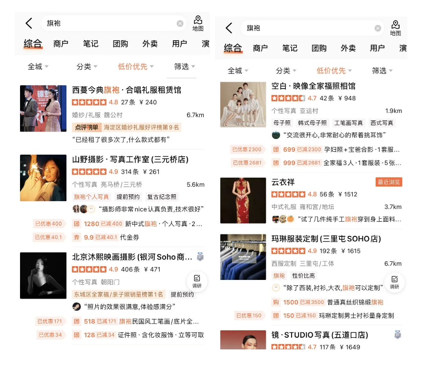 我也想找一家试试看,谁承想偌大北京城,竟然没有搜寻到菜市场价位的实体旗袍店,大众点评上按“低价优先”排出来的第一家旗袍店人均1512元——看来北京只有真·高定。