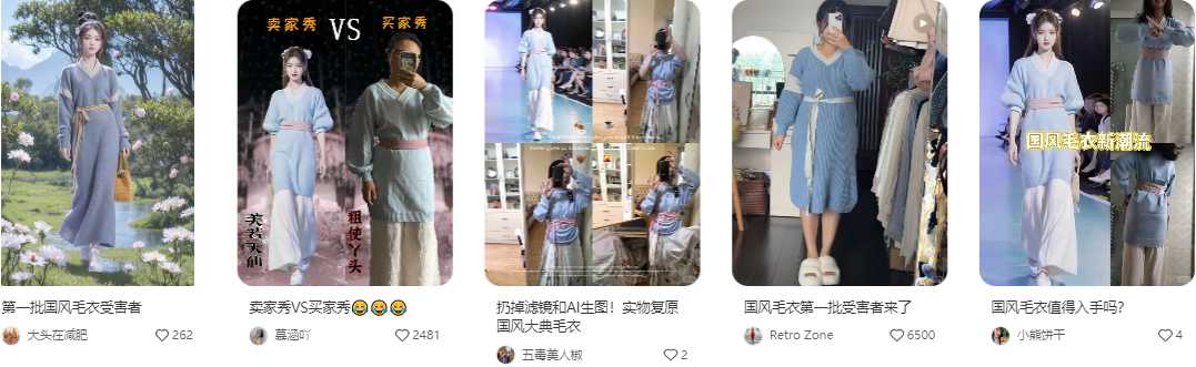偶尔有让你眼前一亮的,那就更请多加小心,因为“诈骗式营销”已经开始渗入服装市场肌理,前段时间引发大量讨论的“国风毛衣裙”,就是用AI做出来的图充当效果展示,买家拿到实物直呼“受害”。