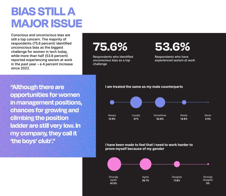 但与此同时的是,性别不平等的问题仍然非常严重。从Web Summit峰会发布的《科技行业性别平等状况报告》来看,仍有近一半的受访者认为,他们的工作单位没有采取适当措施来消除性别不平等;有53.6%的女性在过去12个月内,经历过职场性别歧视;有77.2%的受访者认为由于性别问题,她们需要更加努力地证明自己。