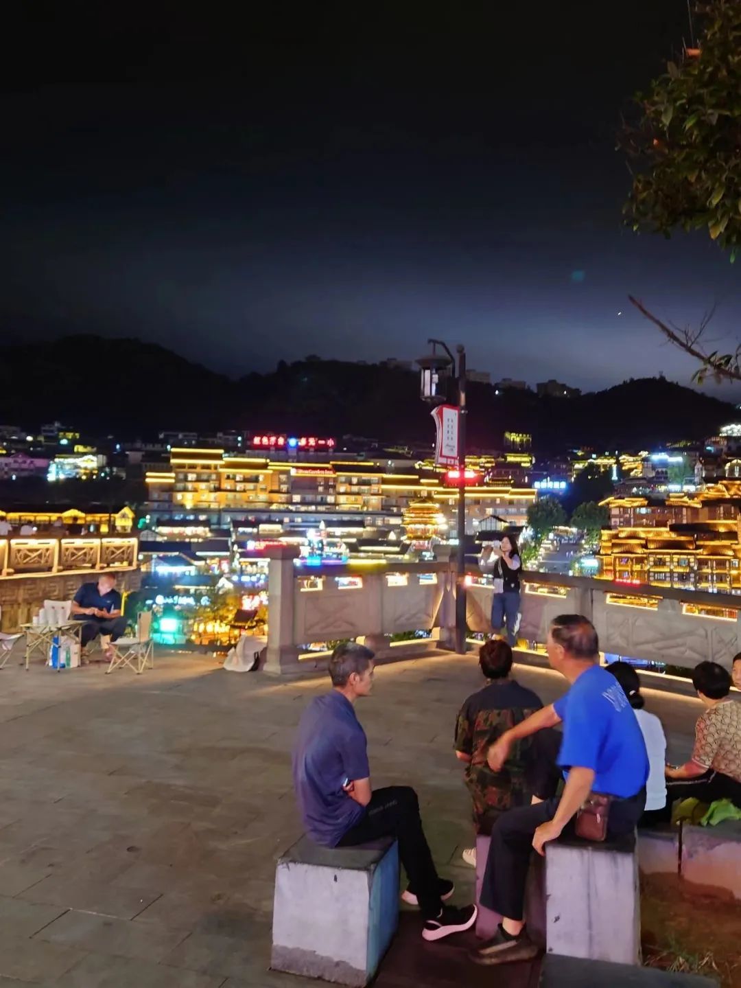 隔着赤水河另一侧高处的观景台,是欣赏小镇金碧辉煌夜景的好地方,除了附近居民饭后坐在这聊天,还有许多小桌板凳,几瓶酒一摆,就成的品酒小摊。